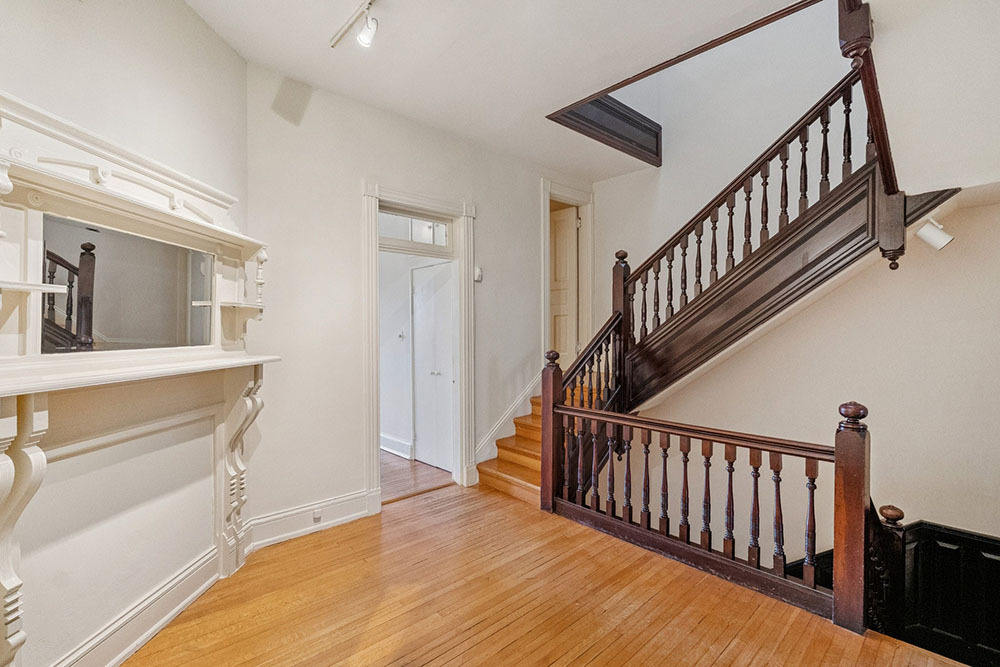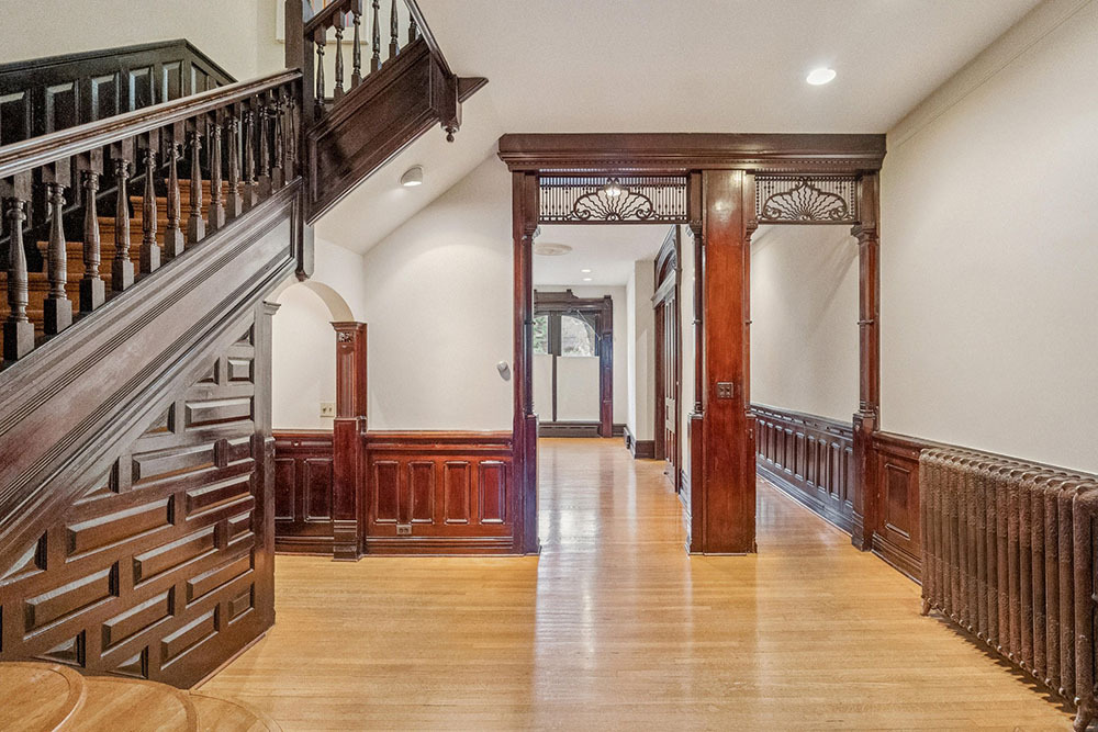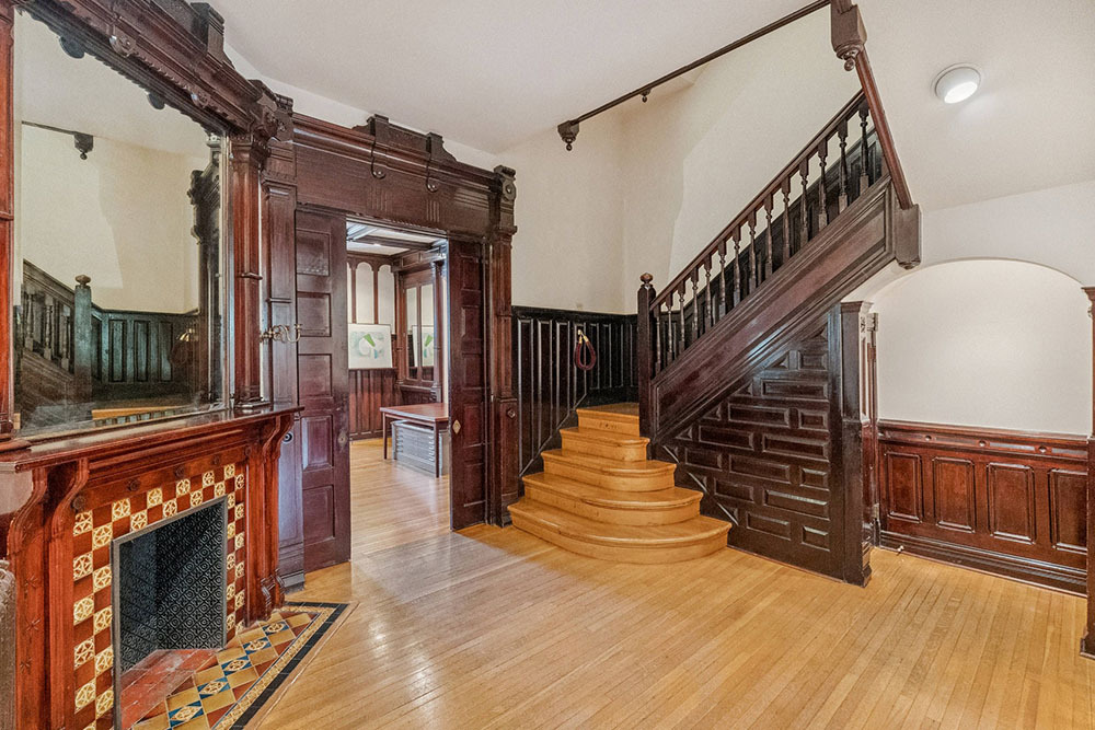 The home features well-preserved 19th-century details including extensive original moldings, multiple fireplaces with historic tile and beveled mirrors, pocket doors, hardwood floors, and exceptional woodwork. A south-facing rear façade brings abundant natural light throughout the main levels.