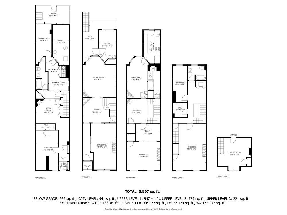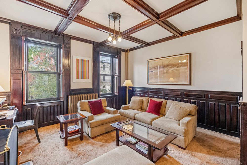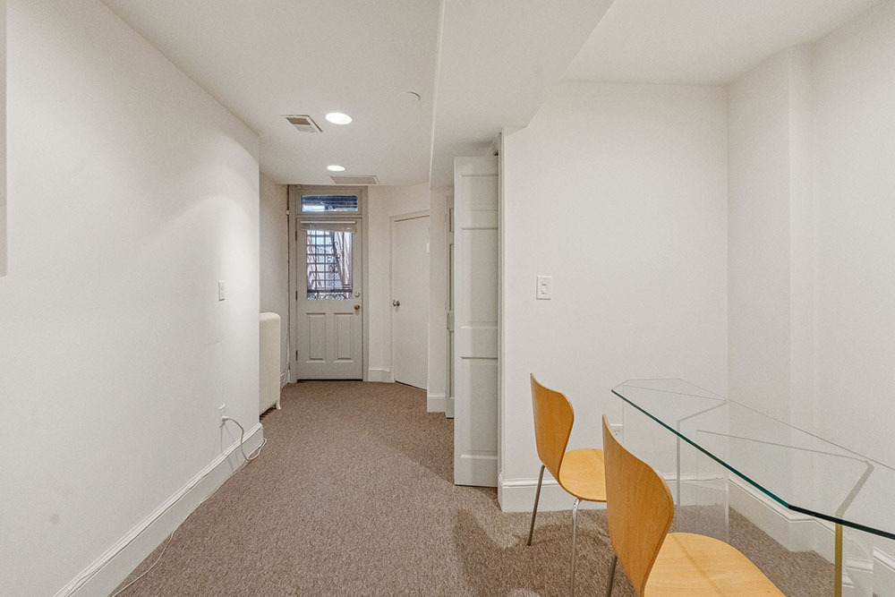 Offering three levels of living space above the lower level plus a fourth-floor loft, the layout provides flexibility for bedrooms, workspace, or potential access to a future roof deck. The main level includes formal living and dining rooms and a rear office. The upper levels offer multiple bedrooms, sitting areas, and full baths. The lower level, with both front and rear entries, may function as extended living space or a separate apartment. Outdoor features include a private rear garden and secure parking for two cars.