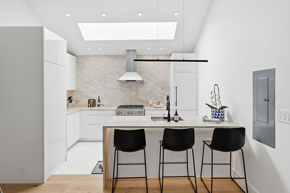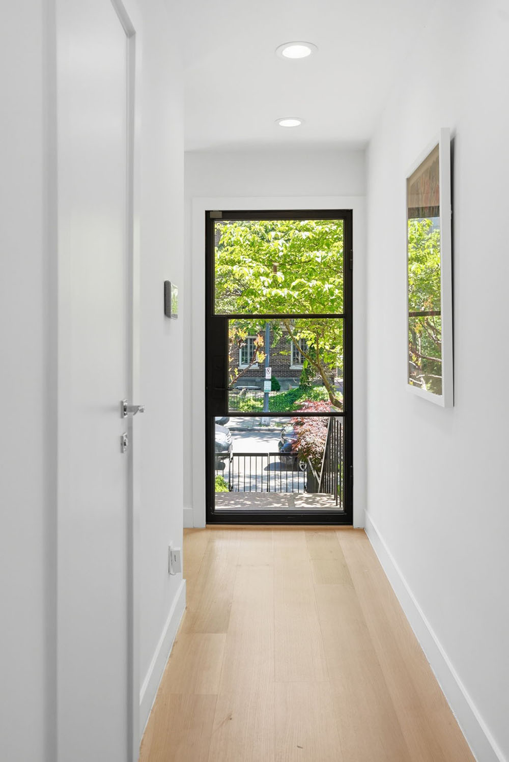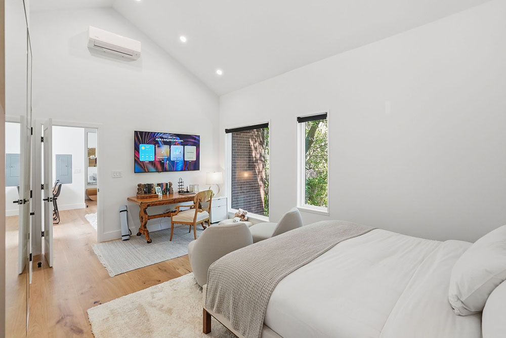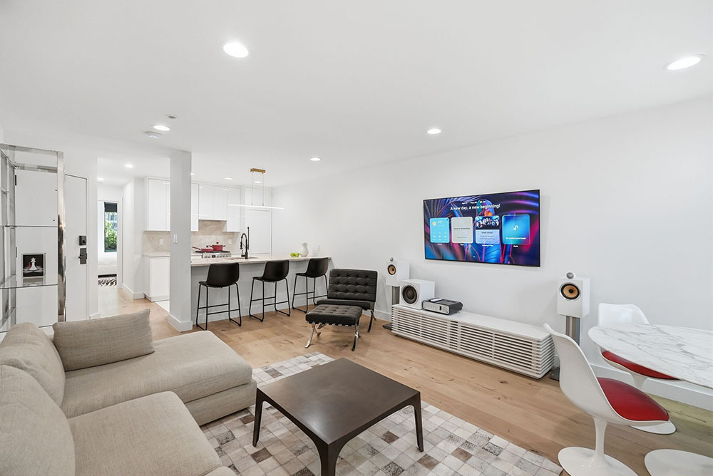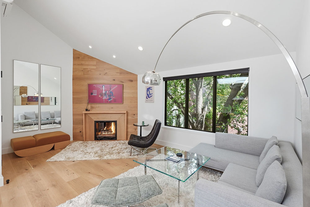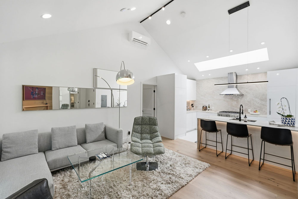 The main residence features three finished levels with custom rift-sawn white oak flooring, natural slab Quartzite in all kitchens, large scale tile in all bathrooms on floors and walls, Italian lacquer cabinetry, and integrated European appliances. Natural light fills the space through new architectural windows and skylights, complementing a total renovation completed in 2026 with new HVAC, roof, and building systems throughout.