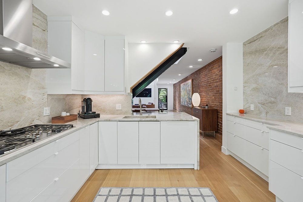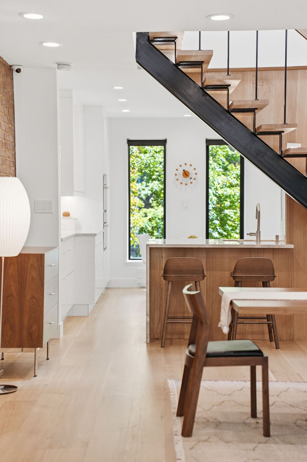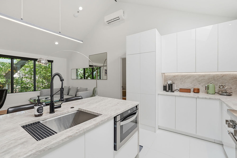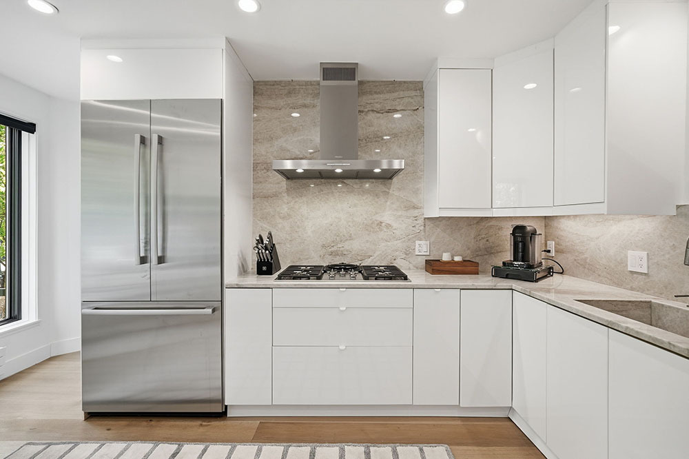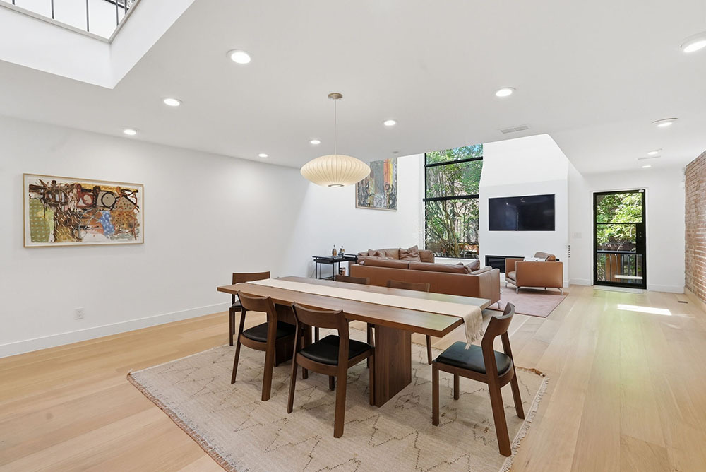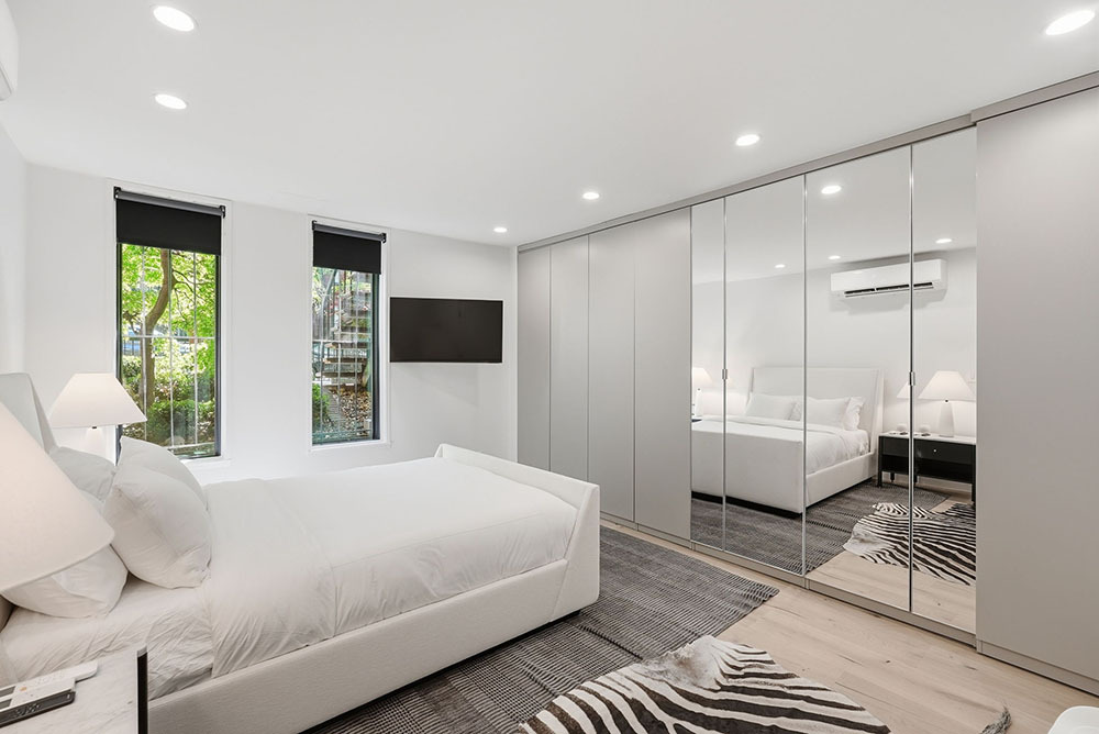The main residence features three finished levels with custom rift-sawn white oak flooring, natural slab Quartzite in all kitchens, large scale tile in all bathrooms on floors and walls, Italian lacquer cabinetry, and integrated European appliances. Natural light fills the space through new architectural windows and skylights, complementing a total renovation completed in 2026 with new HVAC, roof, and building systems throughout.