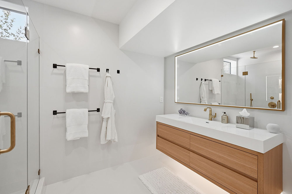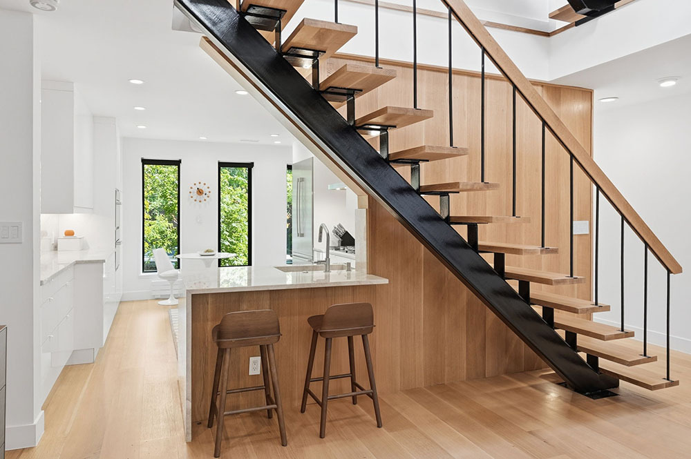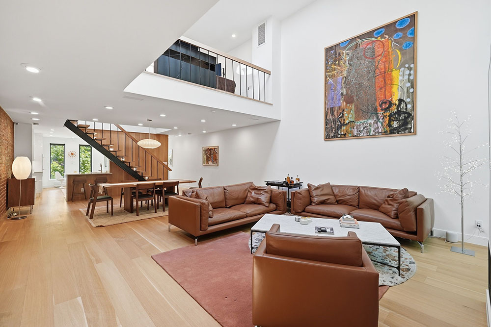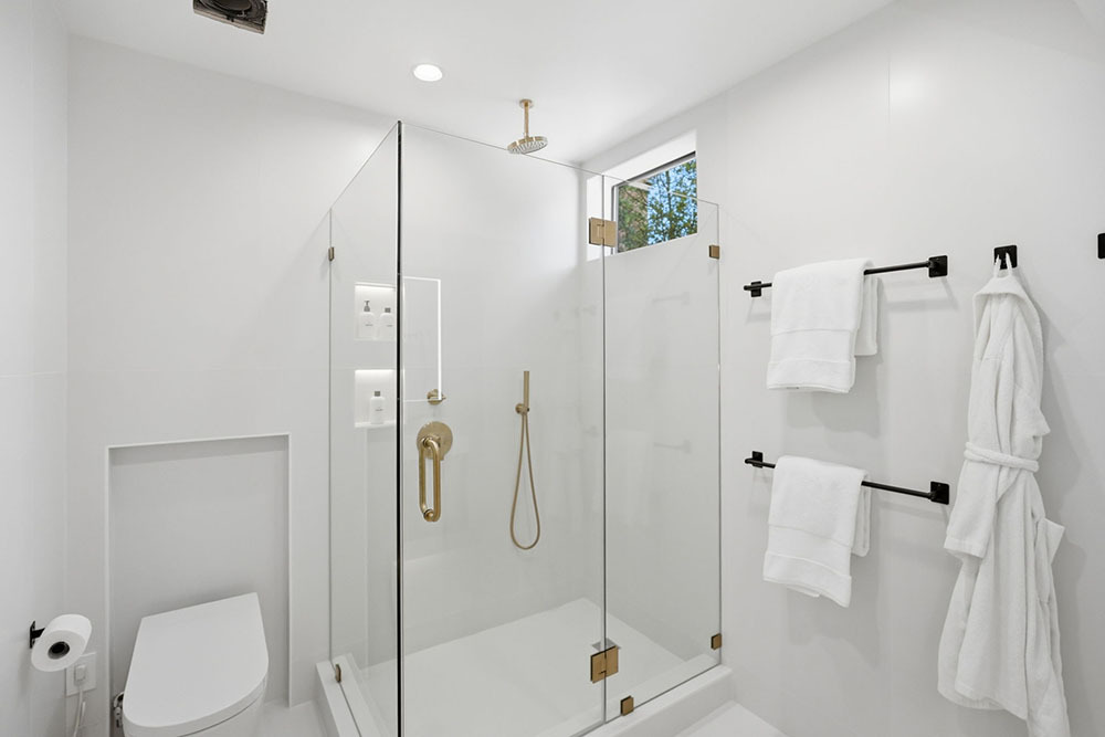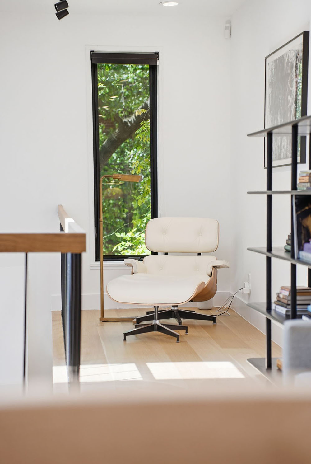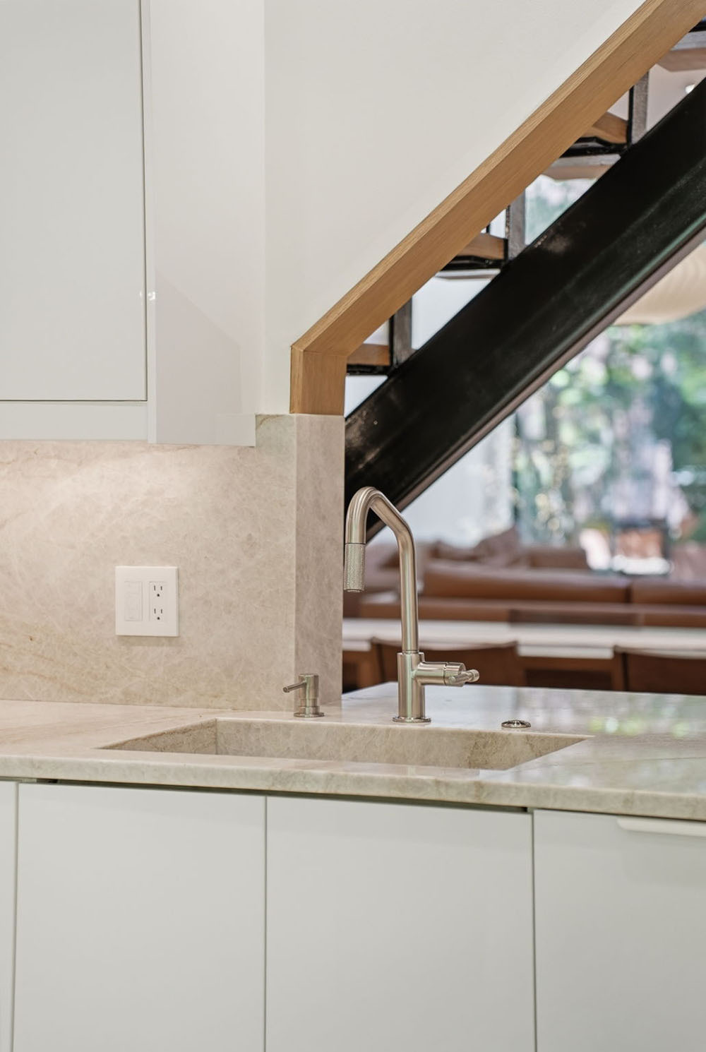 The main residence features three finished levels with custom rift-sawn white oak flooring, natural slab Quartzite in all kitchens, large scale tile in all bathrooms on floors and walls, Italian lacquer cabinetry, and integrated European appliances. Natural light fills the space through new architectural windows and skylights, complementing a total renovation completed in 2026 with new HVAC, roof, and building systems throughout.