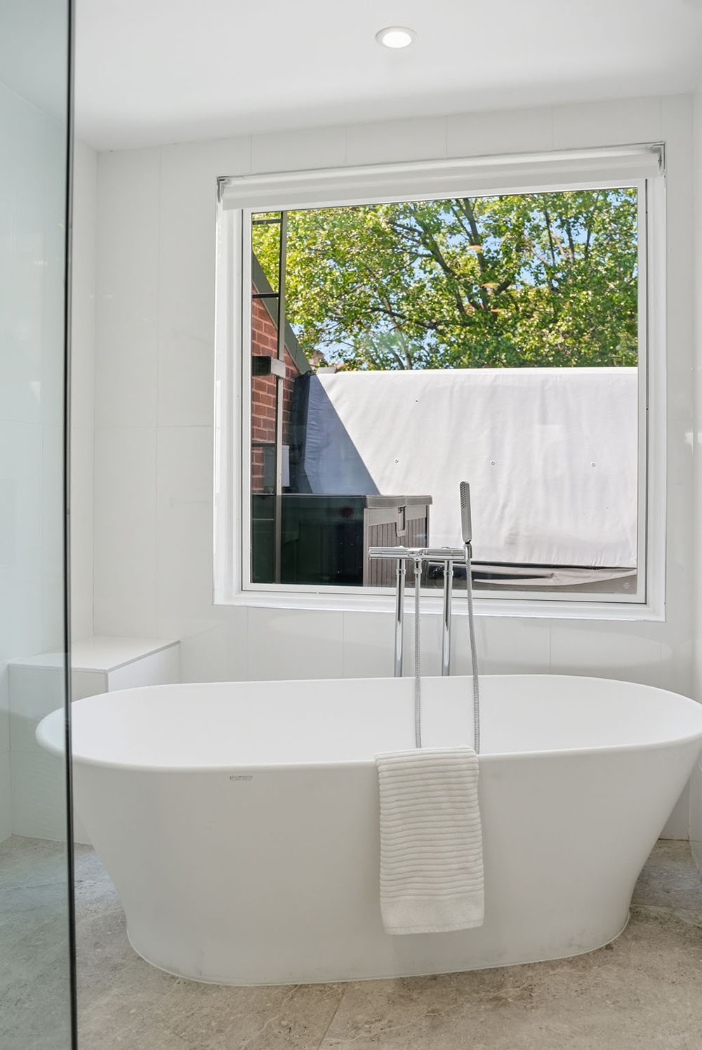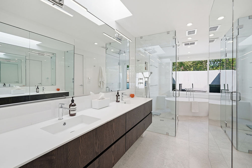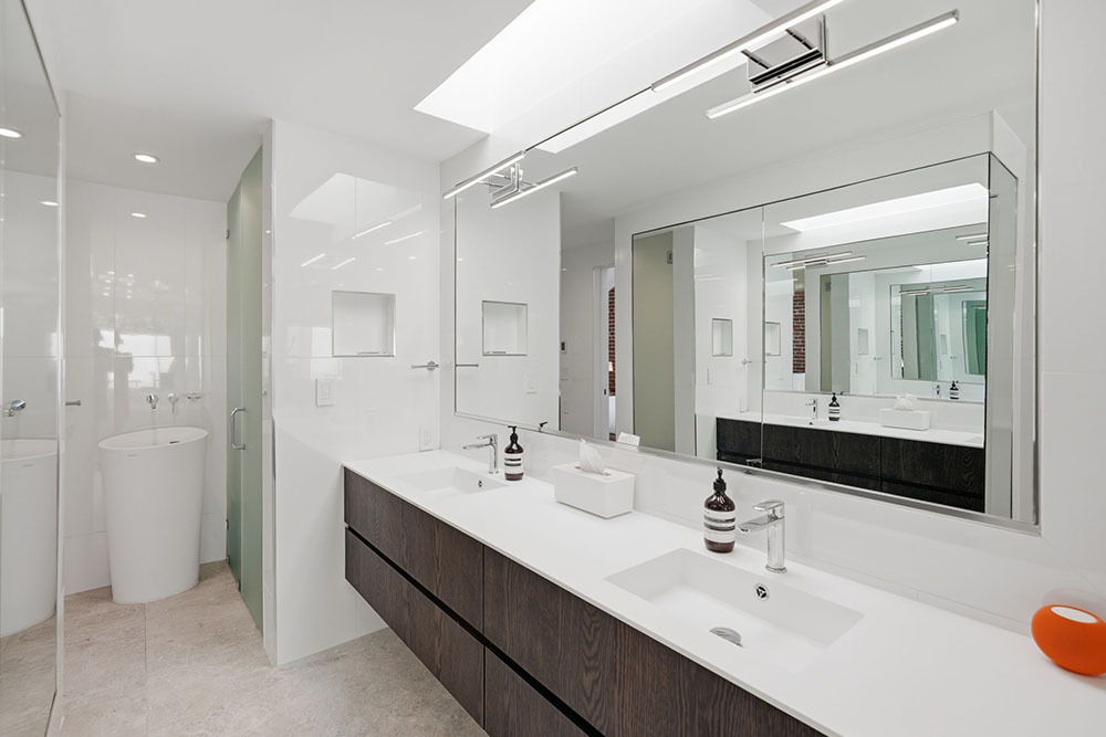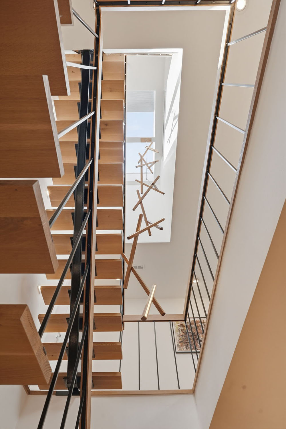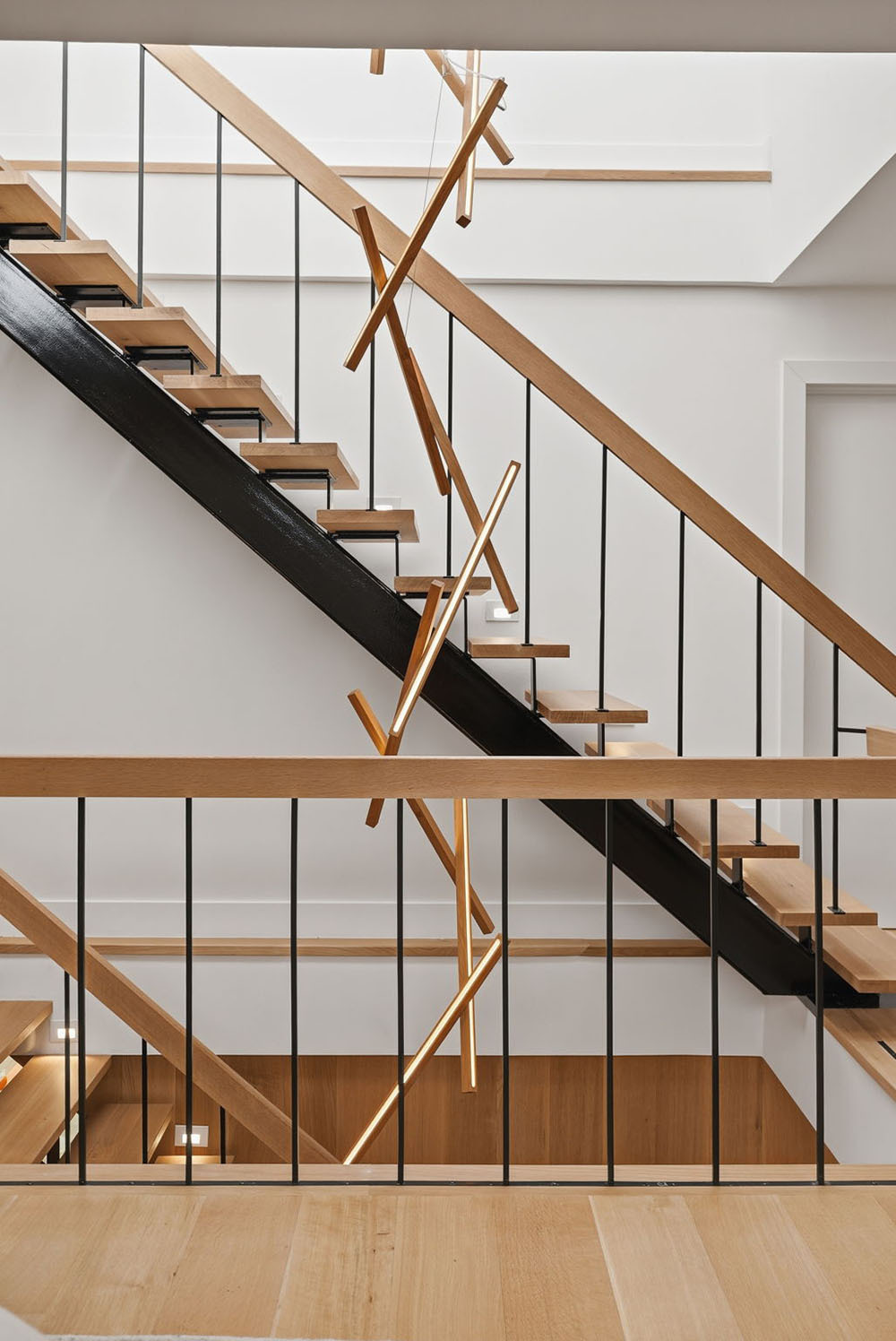 The main residence features three finished levels with custom rift-sawn white oak flooring, natural slab Quartzite in all kitchens, large scale tile in all bathrooms on floors and walls, Italian lacquer cabinetry, and integrated European appliances. Natural light fills the space through new architectural windows and skylights, complementing a total renovation completed in 2026 with new HVAC, roof, and building systems throughout.